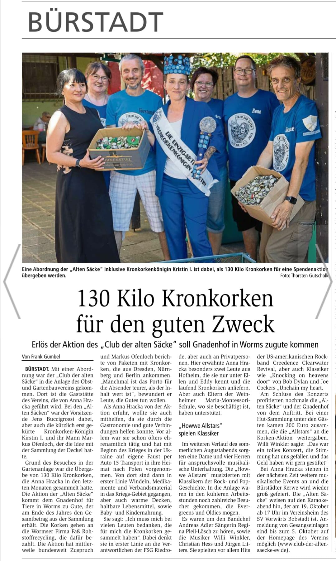 Am Mittwoch (13.03.2024) hat der Mannheimer Morgen einen tollen Artikel über uns und unsere Kronkorken Aktion veröffentlicht.